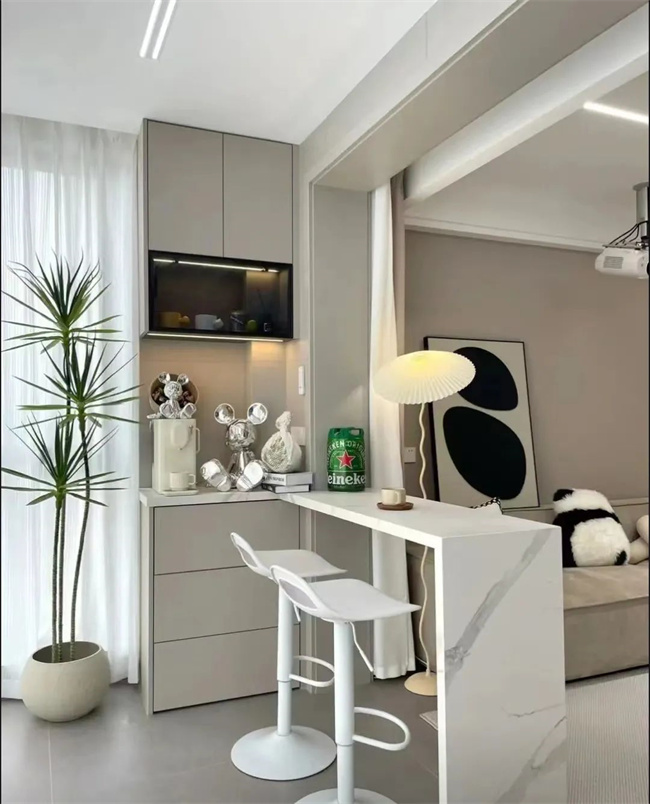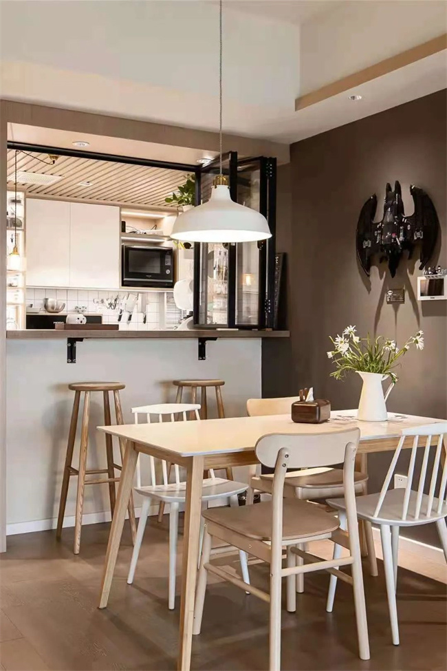 開窗處定制臺面,放上吧臺椅,簡直不要太愜意。這種設(shè)計既不會把空間割裂成單獨個體,讓家人的互動感增強,又具有很強的設(shè)計感。