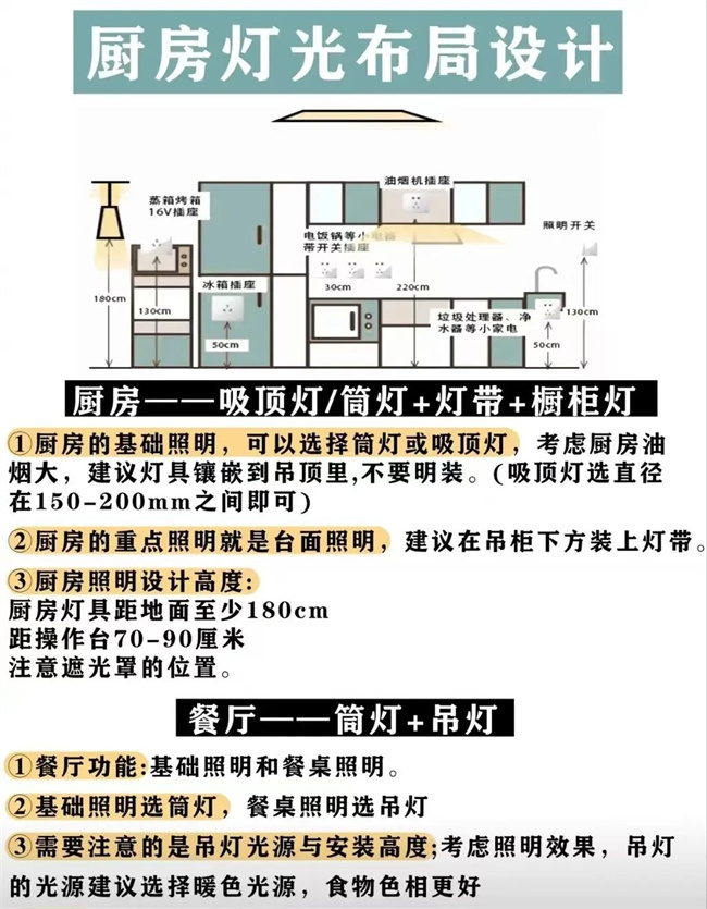 貼著吊柜底部用T5燈管做操作臺照明,吊柜照明射燈選擇3~5W,每隔30cm布置一盞。島臺照明參考餐桌即可。