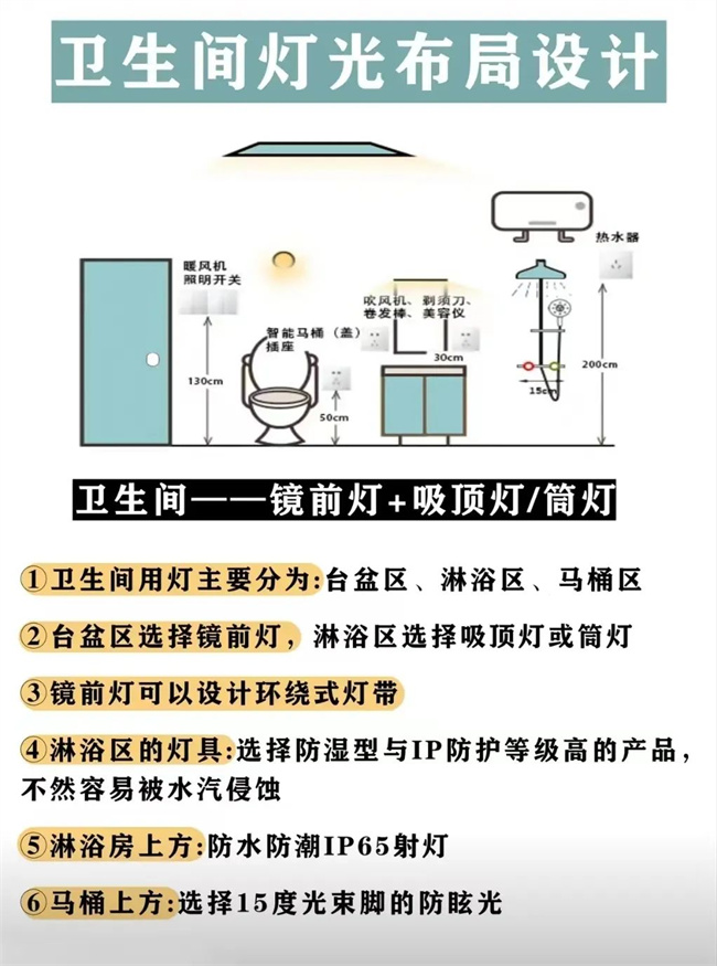 如果用射燈代替吸頂燈,分別在洗手池、馬桶、花灑、浴缸正上方裝一盞3W的射燈就夠用了。