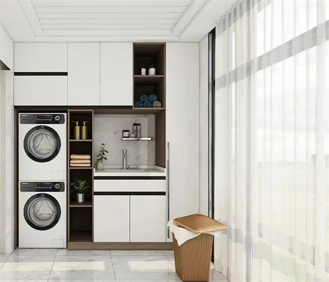 家務(wù)陽臺的主要功能:洗烘+晾曬+收納+清潔。
