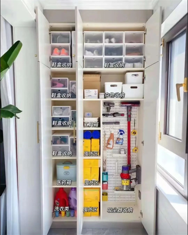 柜子、擱板,或直接用架子收納。如果要放吸塵器,無線吸塵器要考慮充電座的收納,和電源插座的位置。