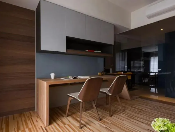 傳統(tǒng)的沙發(fā)布局,入座后面朝的是電視機。人和人雖然離得很近,但是卻缺乏溝通??蛷d書房一體化的設計,以書桌為空間核心。讓一家人有了更多面對面而坐的時間。想一想,你多久沒有和伴侶、孩子促膝長談了?!