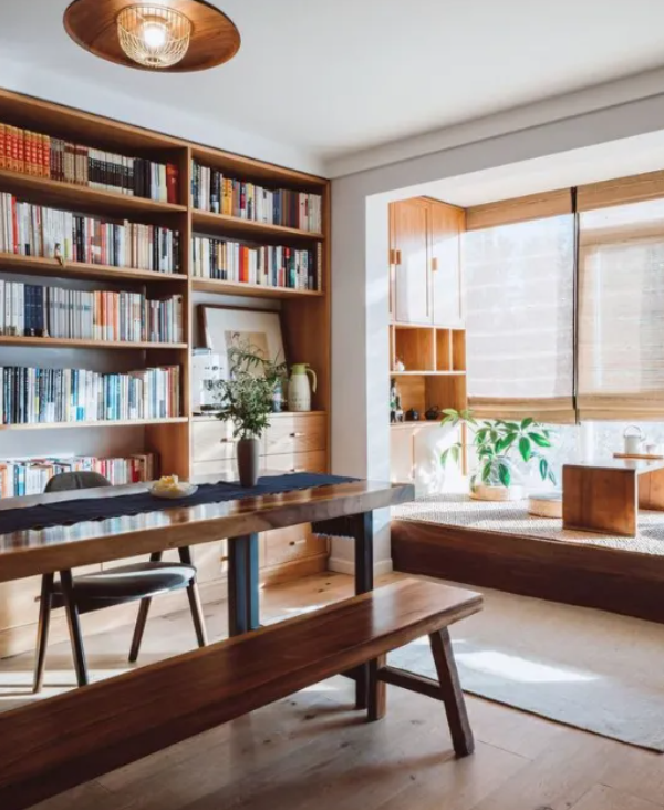 但是,今天給大家安利一款打破常規(guī)的客廳布局——將書房搬到客廳的一體化設計!即在客廳空間里打造一整面墻的書柜&收納柜,再放一張大大的手工桌??磿?、做作業(yè)、喝茶都能滿足。