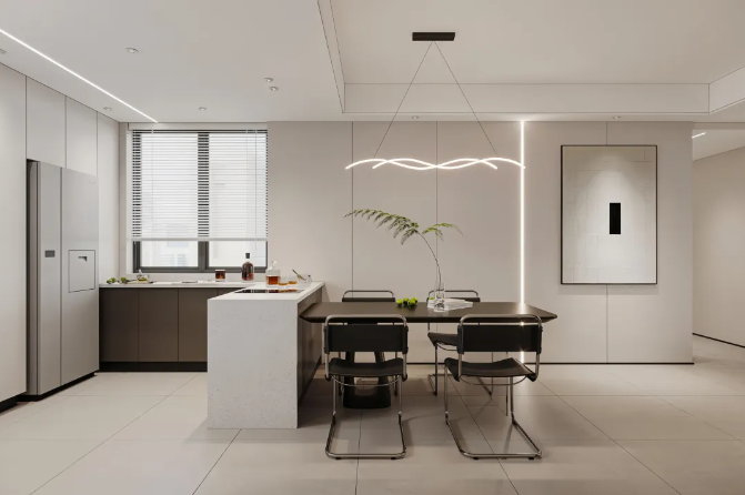 開放式廚房的設(shè)計增加餐廳的開放性和通透性。嵌入式燈帶提高照明的同時也增加了餐廳的觀賞性,為家庭增添一份雅致和品味。